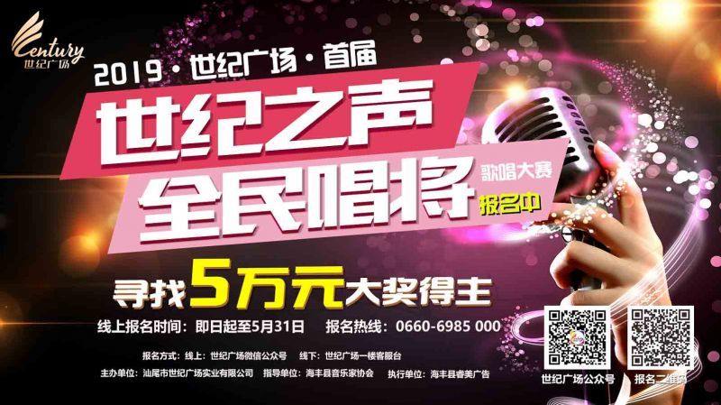 海豐縣2019 世紀(jì)廣場首屆“世紀(jì)之聲 全民唱將”歌唱大賽報名中